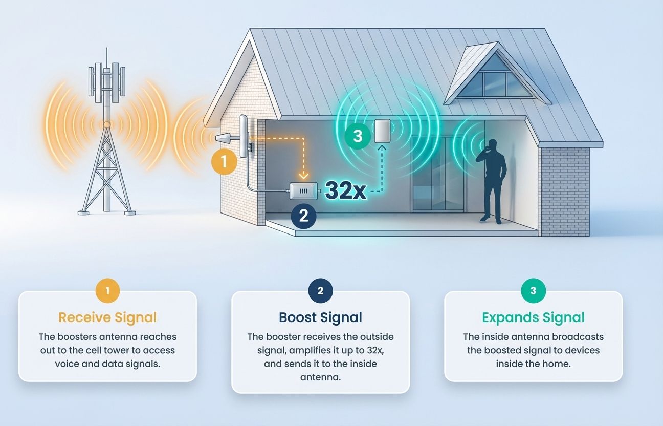 The amplifier boosts that weak signal to make it 5 bar strong. After boosting the signal it sends that amplified signal to the internal antenna. Then the internal antenna broadcasts that boosted signals inside the building. This way the residents in the building enjoy boosted strong signal reception.